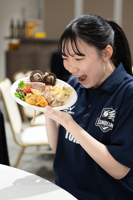 ゲストとして上記2社を含む各協賛企業の社員、選手の父兄に加え、かつてサンビームズでプレーしたOGも参加。限られた人数ではあるが一部のファンも招待を受け、「バレー愛」「サンビームズ愛」の光線が随所に飛び交う温かな会が執り行われた。