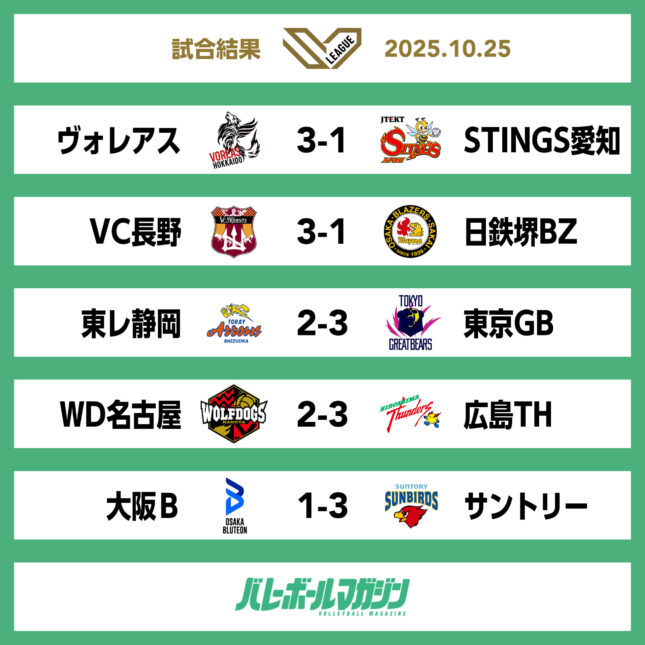 - SVリーグ男子が開幕。大阪Bがサントリーに3-1で勝利し、白星発進 [SV男子] / 2025.10.25
