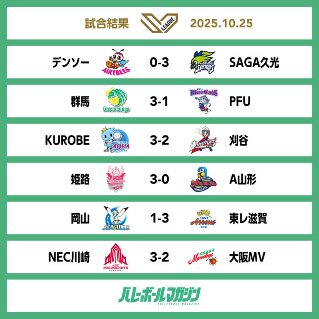 - サントリーと大阪Bは1勝1敗に。ヴォレアスがSTINGS愛知、VC長野が日鉄堺BZに3-1で勝利。東京GB、広島THはアウェーでフルセットの末、初戦勝利を掴む SV男子 [V男子] / 2025.10.26
