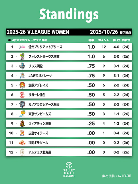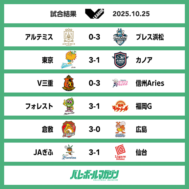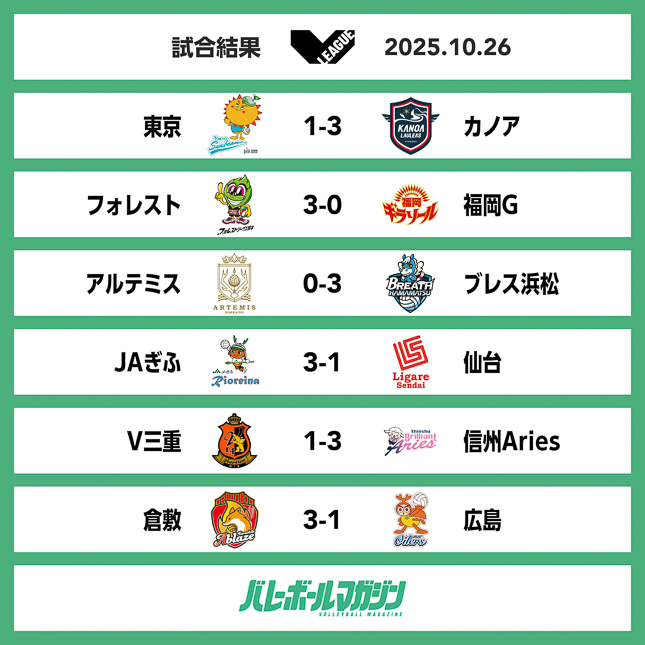 - サントリーと大阪Bは1勝1敗に。ヴォレアスがSTINGS愛知、VC長野が日鉄堺BZに3-1で勝利。東京GB、広島THはアウェーでフルセットの末、初戦勝利を掴む SV男子 [V男子] / 2025.10.26