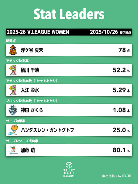 - NEC川崎が昨季女王の大阪MVに2試合連続のフルセット勝利で、開幕6連勝。KUROBE、姫路も5勝目を挙げる SV女子 [SV女子] / 2025.10.26