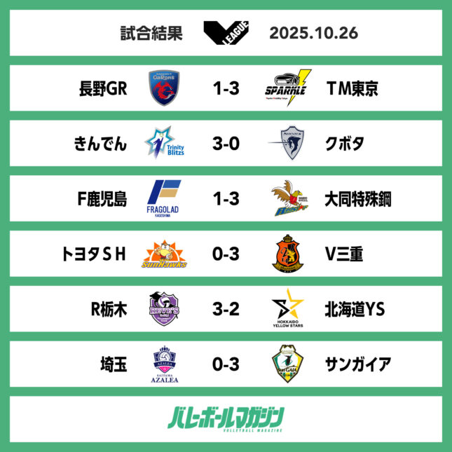 - サントリーと大阪Bは1勝1敗に。ヴォレアスがSTINGS愛知、VC長野が日鉄堺BZに3-1で勝利。東京GB、広島THはアウェーでフルセットの末、初戦勝利を掴む SV男子 [SV男子] / 2025.10.26