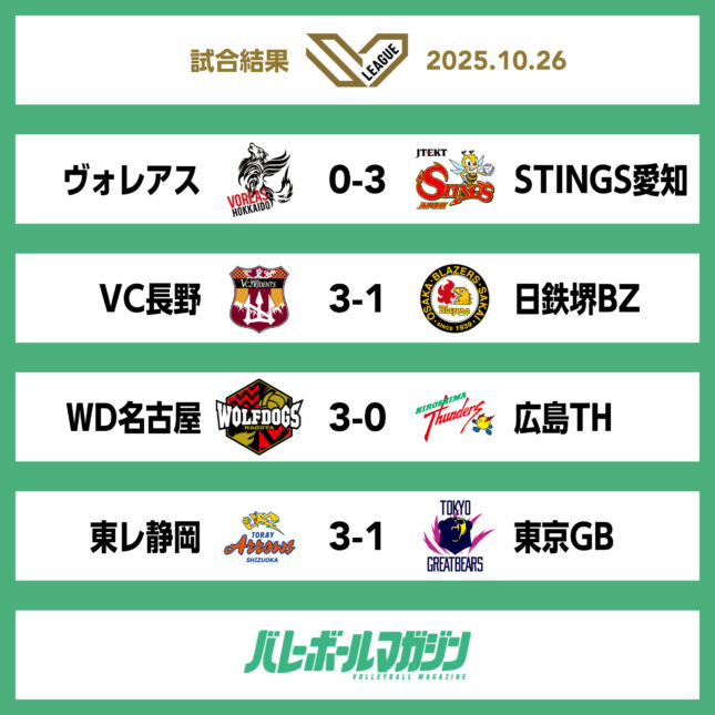 VC長野が開幕2連勝で首位に。WD名古屋、STINGS愛知、東レ静岡はGAME2でリベンジ SV男子