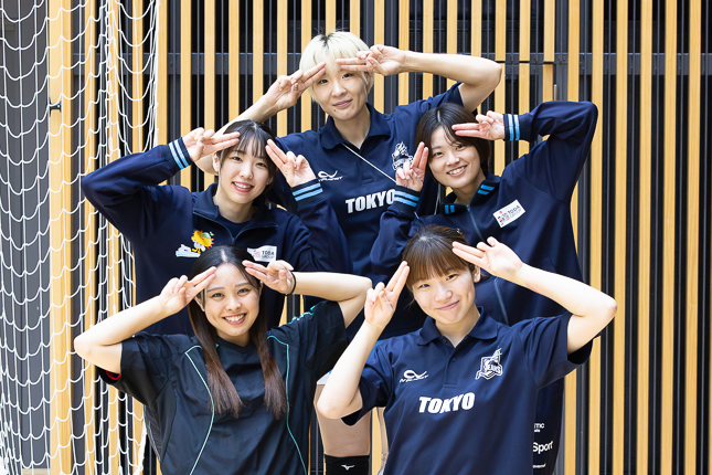 東京サンビームズ・森田英莉主将、久保木若菜、小泉海藍、ハンダスレン・ガントグトフ、今村芽維「こちらが先手を取っていく、そしてボールを落とさない執念をもってどんな相手にも立ち向かっていく」 V女子