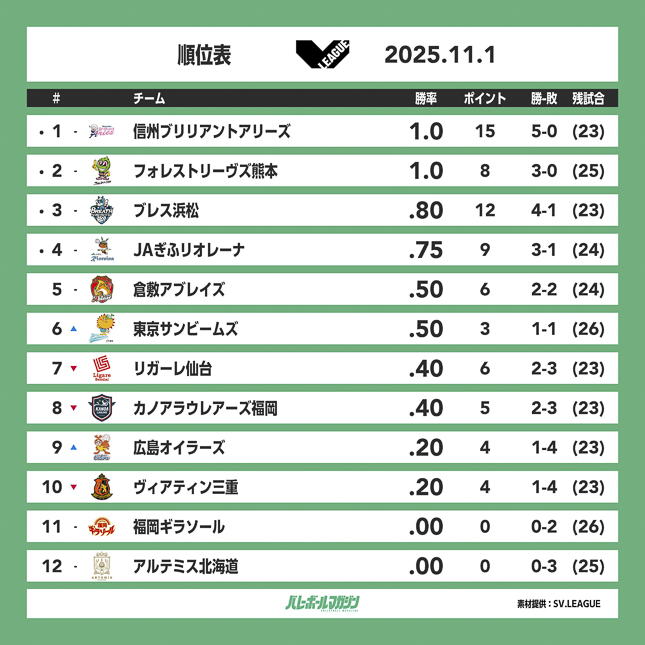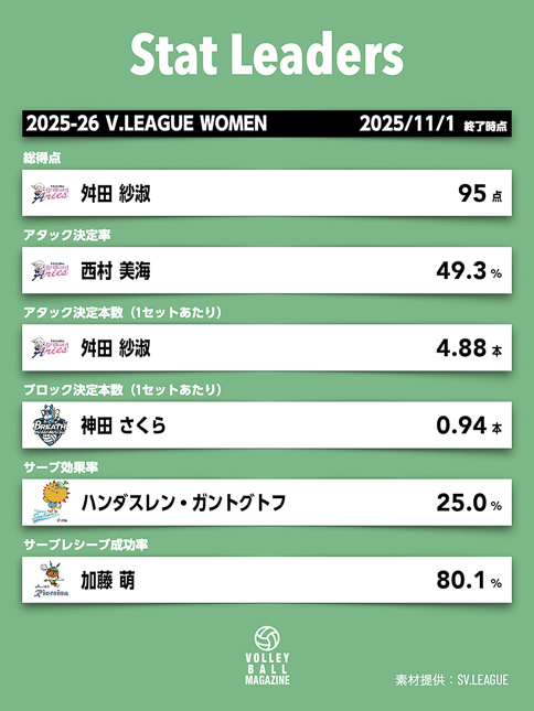 - 姫路とKUROBEが開幕6連勝でNEC川崎に並ぶ。ポイントの差で姫路が首位に SV女子 [SV女子] / 2025.10.27