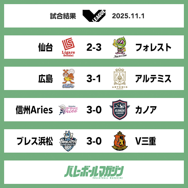 ヒルズはねっこアリーナ(宮城県)では昨季ベスト4同士の好カード。フォレストが仙台をフルセットで制している。