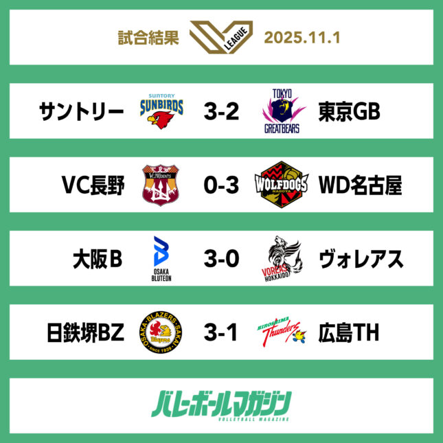 WD名古屋、大阪B、サントリーが2勝目。サントリーはホームで東京GBにフルセット勝利 SV男子