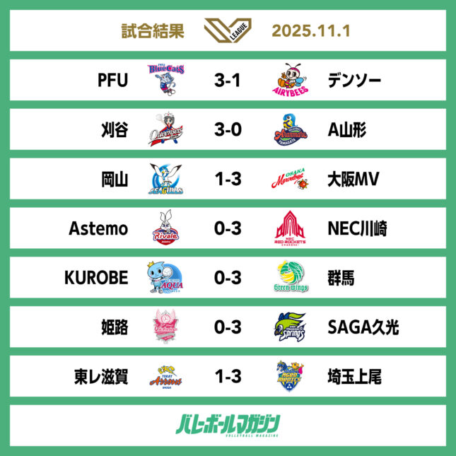 とり野菜みそ BLUECATS ARENAではホームのPFUブルーキャッツ石川かほくがデンソーエアリービーズと対戦し、セットカウント3-1で勝利した。ウィングアリーナ刈谷ではホームのクインシーズ刈谷がアランマーレ山形と対戦し、セットカウント3-0のストレートで勝利。シゲトーアリーナ岡山ではホームの岡山シーガルズが大阪マーヴェラスと対戦し、セットカウント1-3で敗れた。PFU、デンソー、刈谷、大阪MVはそれぞれ3勝4敗。今季まだ白星のないA山形と岡山は2日のGAME2で初勝利を目指す。