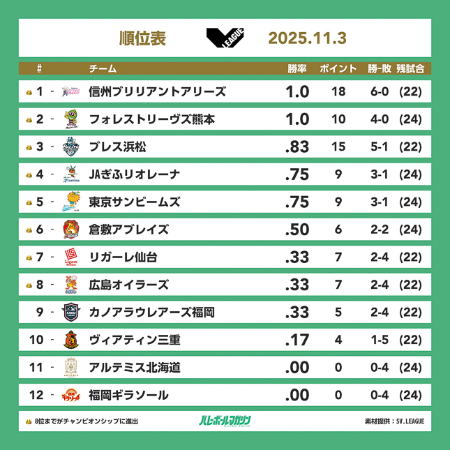 1位 信州ブリリアントアリーズ 6勝0敗 (勝率1.00, 18ポイント)