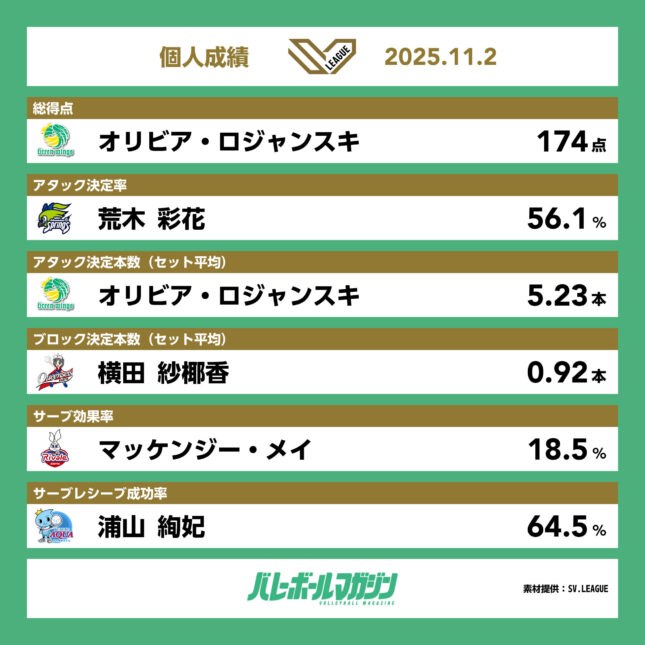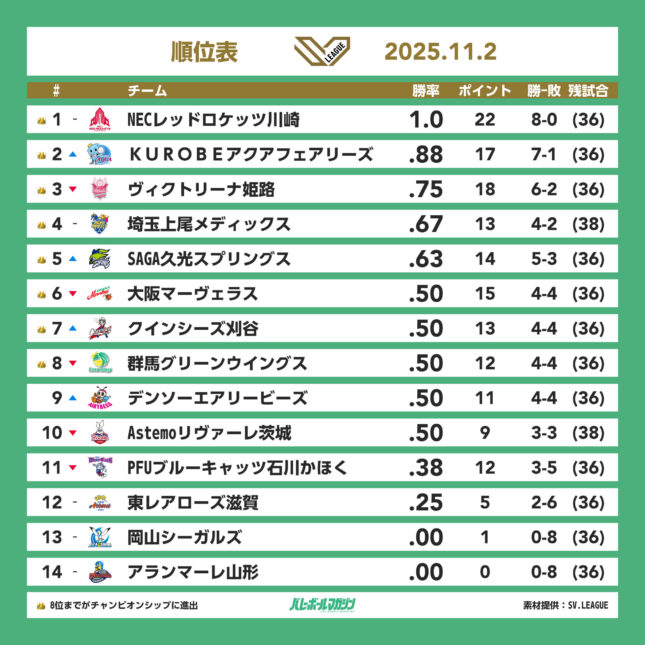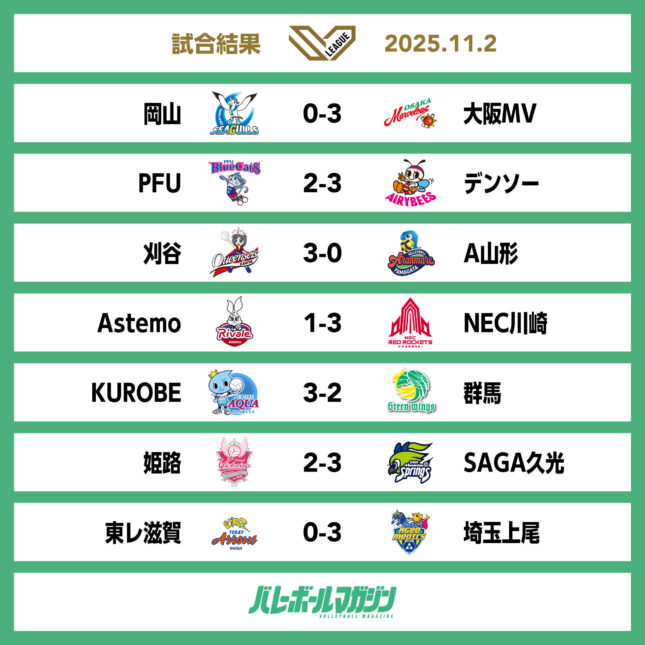- 大阪MVが4位に浮上。姫路が10勝目。SAGA久光が11連勝 SV女子 [SV女子] / 2025.11.23