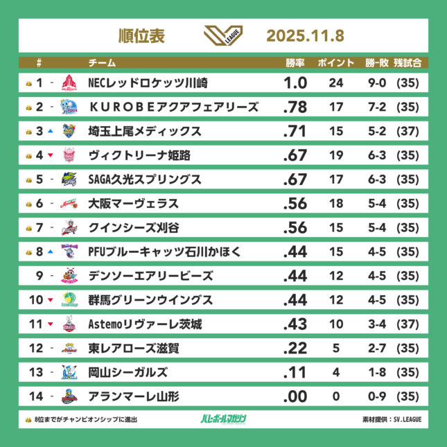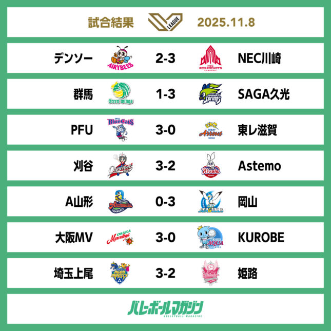 - 東西全チームが初戦を終える。8日は7試合すべてホームチームが勝利 V男子 [V男子] / 2025.11.09