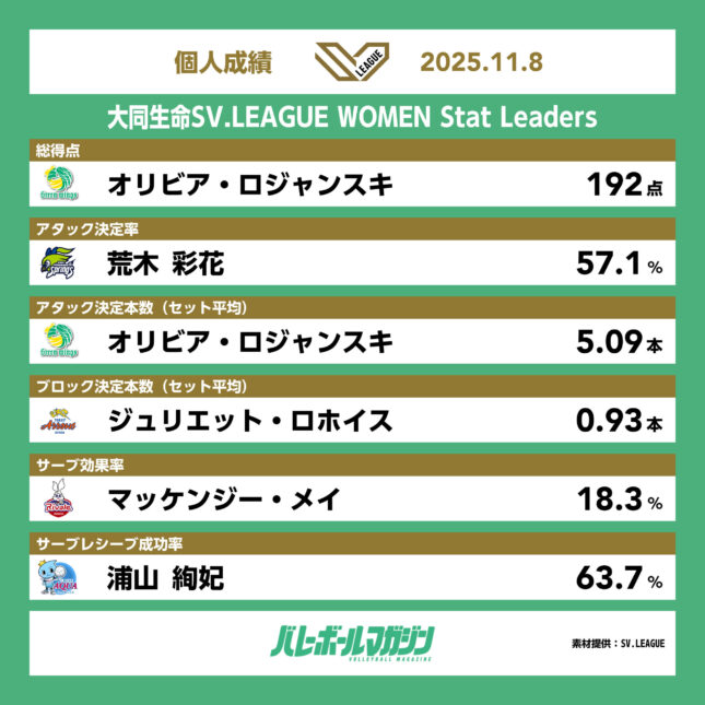 8日、バレーボール女子・大同生命SV.LEAGUE WOMENは7試合が行われた。