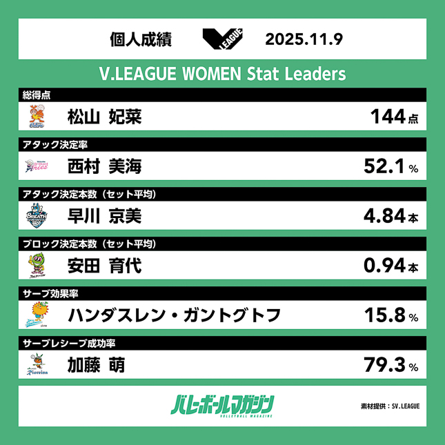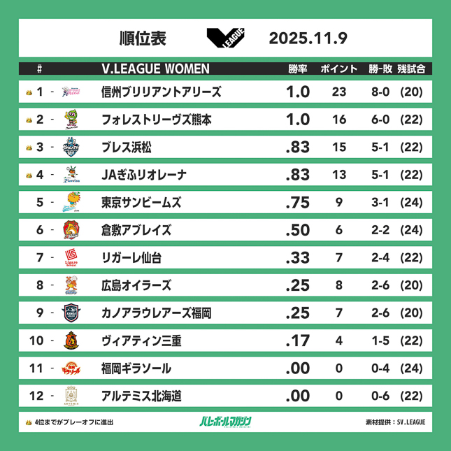 - 埼玉上尾がフルセットの末姫路を破り、3位に浮上。岡山がアウェーで念願の初勝利 SV女子 [SV女子] / 2025.11.09