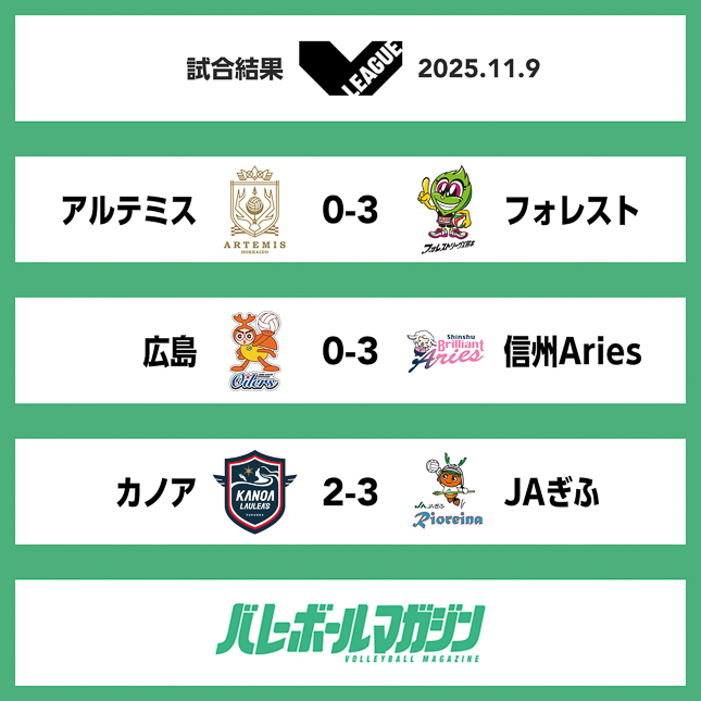 【V.LEAGUE WOMEN・9日の結果】