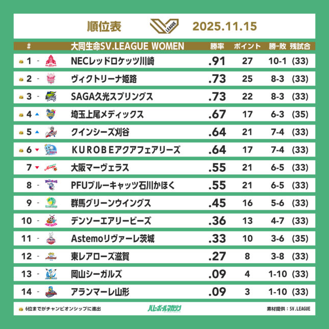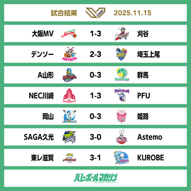 - 大阪Bとサントリーが1敗を守り、6勝目。広島THが4勝目、VC長野は3勝目を挙げる SV男子 [SV男子] / 2025.11.16