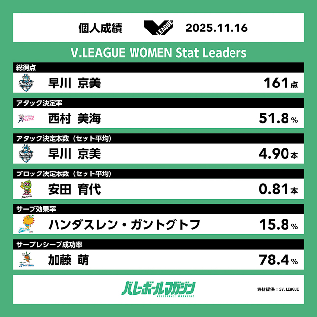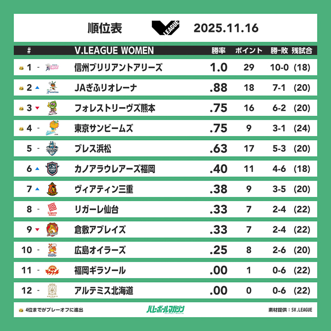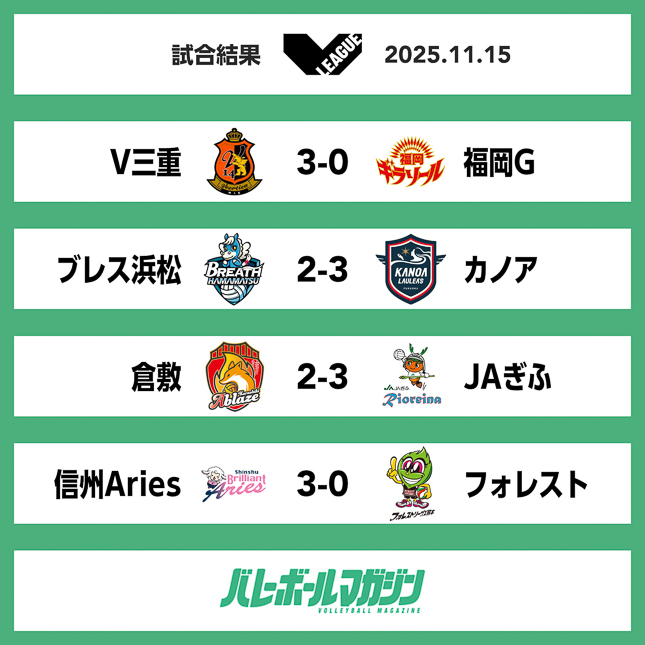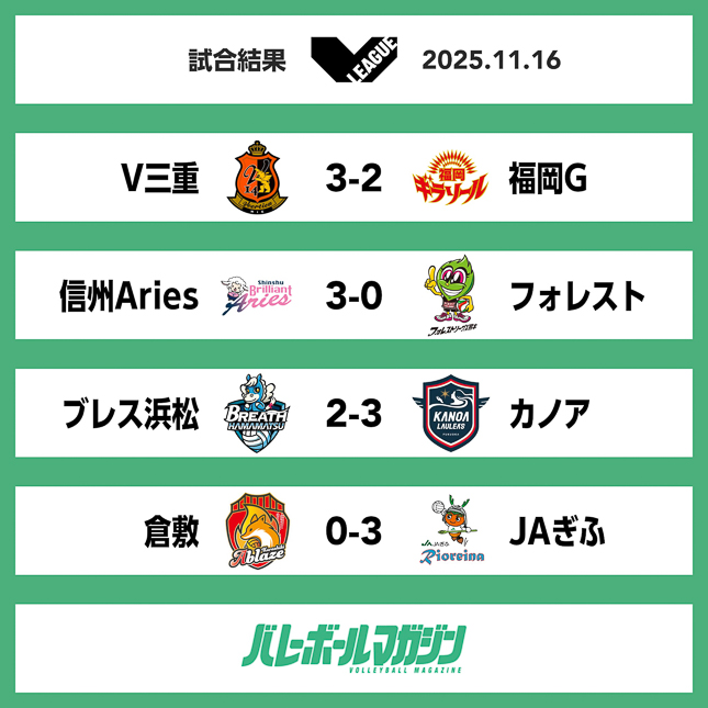 - 大阪Bとサントリーが1敗を守り、6勝目。広島THが4勝目、VC長野は3勝目を挙げる SV男子 [SV男子] / 2025.11.16