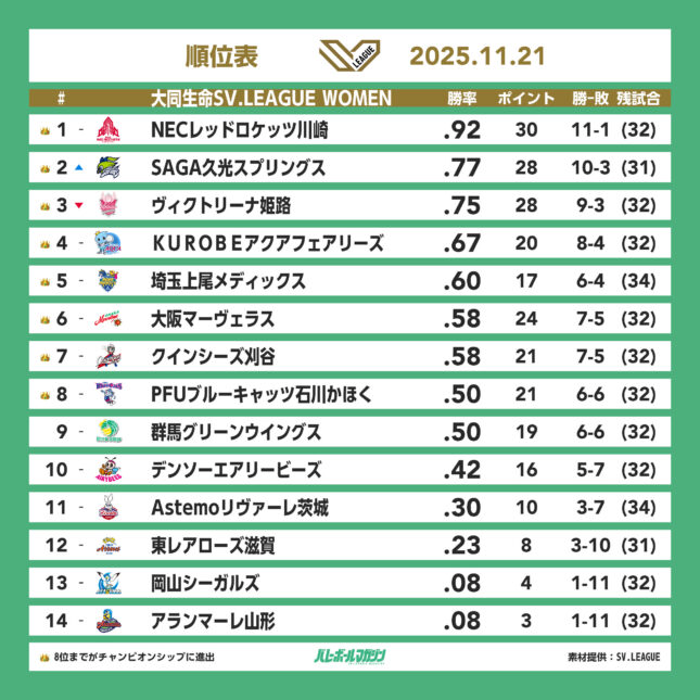 - NEC川崎がPFUに3-0でリベンジし、11勝目。GAME2は7試合中6試合がストレートで決着 SV女子 [SV女子] / 2025.11.17
