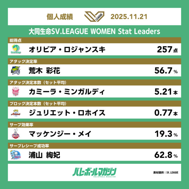 大同生命SV.LEAGUE WOMEN・21日の結果