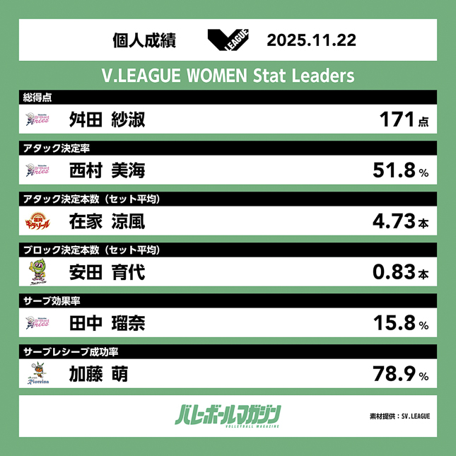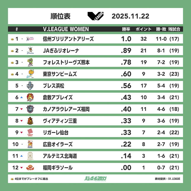 - 大阪MVが4位に浮上。姫路が10勝目。SAGA久光が11連勝 SV女子 [SV女子] / 2025.11.23