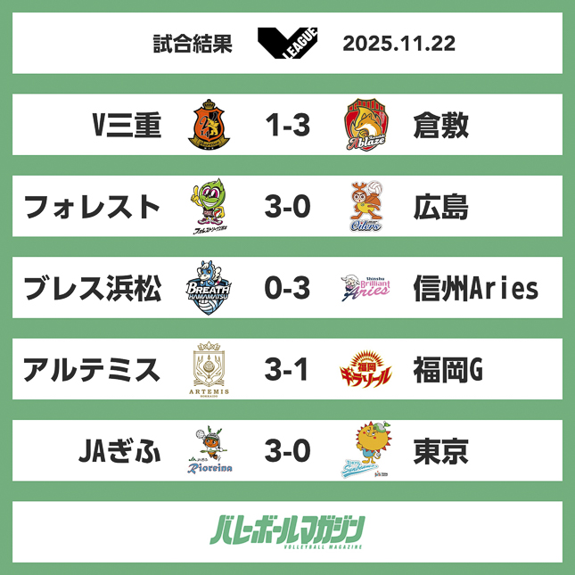 - 全試合アウェイチームが勝利。上位3チームと5位のSTINGS愛知が白星を重ねる。東京GBがフルセットの激闘を制し、6位に浮上 SV男子 [SV男子] / 2025.11.23