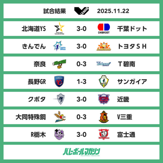 - 全試合アウェイチームが勝利。上位3チームと5位のSTINGS愛知が白星を重ねる。東京GBがフルセットの激闘を制し、6位に浮上 SV男子 [SV男子] / 2025.11.23