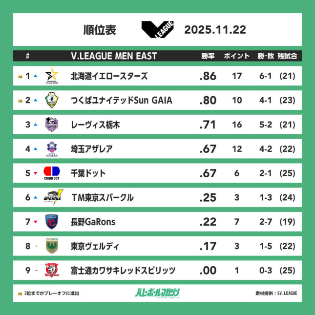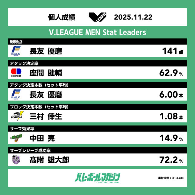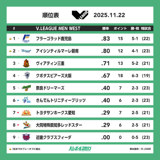 - 全試合アウェイチームが勝利。上位3チームと5位のSTINGS愛知が白星を重ねる。東京GBがフルセットの激闘を制し、6位に浮上 SV男子 [SV男子] / 2025.11.23