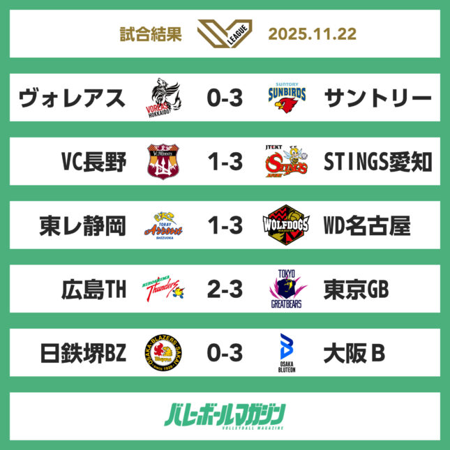 和歌山ビッグホエールでは日本製鉄堺ブレイザーズと大阪ブルテオンが対戦し、セットカウント0-3のストレートでアウェイの大阪Bが勝利し、8勝目。首位をキープした。