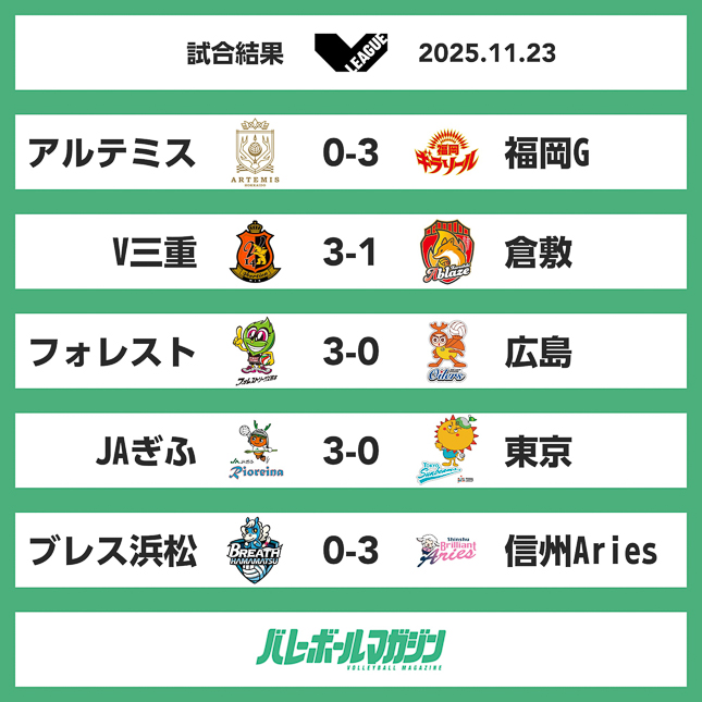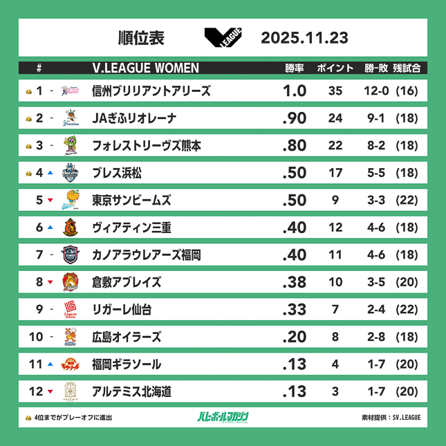 - 川口太一率いるJAぎふリオレーナが怒涛の7連勝、アルテミス北海道がVリーグ初勝利 V女子 [V女子] / 2025.11.23