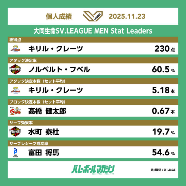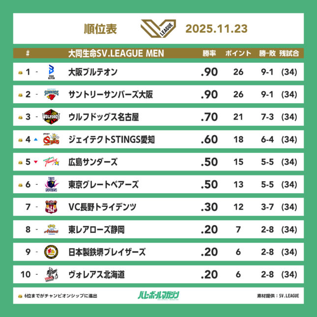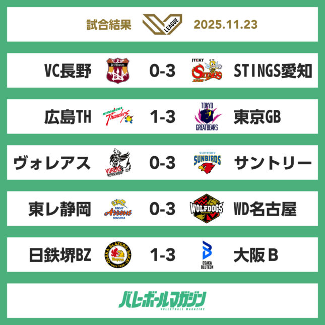 - 全試合アウェイチームが勝利。上位3チームと5位のSTINGS愛知が白星を重ねる。東京GBがフルセットの激闘を制し、6位に浮上 SV男子 [SV男子] / 2025.11.23