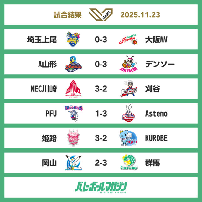 - 全試合アウェイチームが勝利。上位3チームと5位のSTINGS愛知が白星を重ねる。東京GBがフルセットの激闘を制し、6位に浮上 SV男子 [SV男子] / 2025.11.23