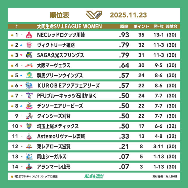 NEC川崎がフルセットを制して13勝目。姫路が11勝目。群馬が5位に浮上 SV女子