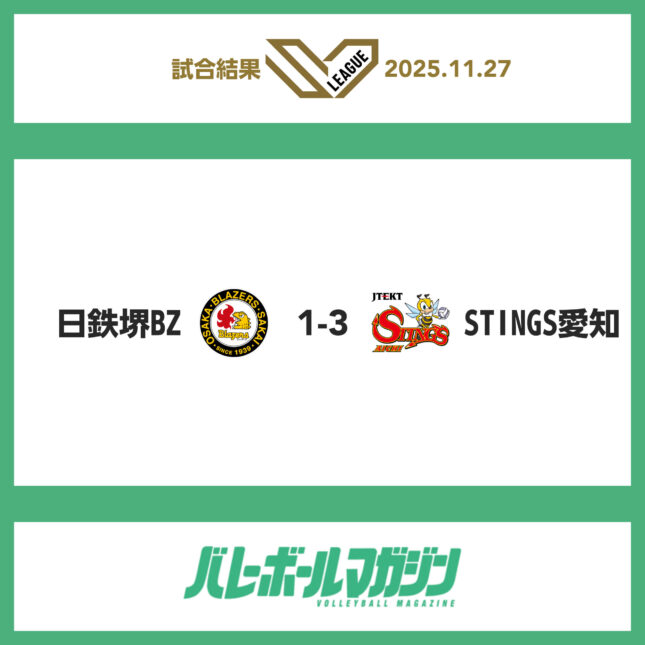 大浜だいしんアリーナでは日本製鉄堺ブレイザーズとジェイテクトSTINGS愛知が対戦し、セットカウント1-3でアウェイのSTINGS愛知が勝利。7勝目を挙げた。