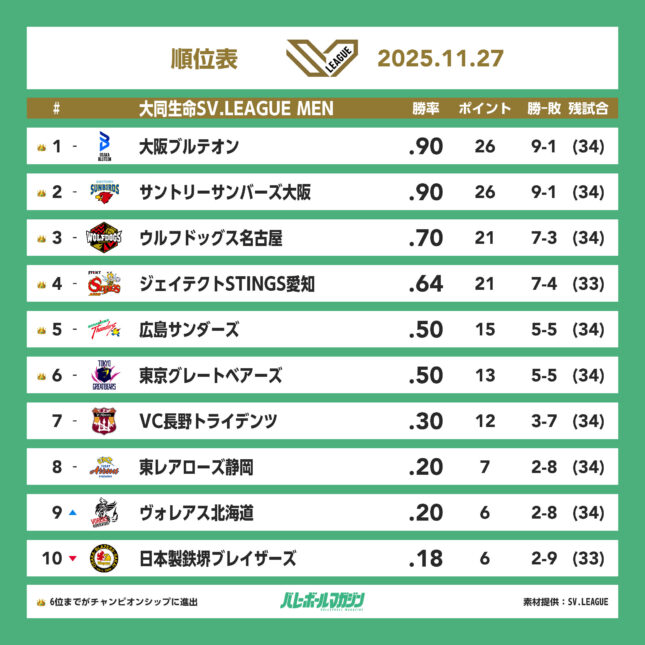 日鉄堺BZは順位を1つ下げて10位に後退した。STINGS愛知の順位は変わらず、4位をキープした。