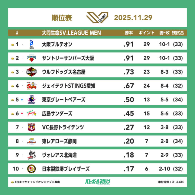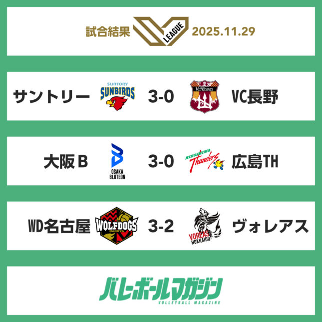 おおきにアリーナ舞洲ではサントリーサンバーズ大阪とVC長野トライデンツが対戦し、セットカウント3-0のストレートでホームのサントリーが勝利。サントリーも10勝目を挙げたが、セット率のわずかな差で2位となっている。7位のVC長野も順位に変動はなかった。