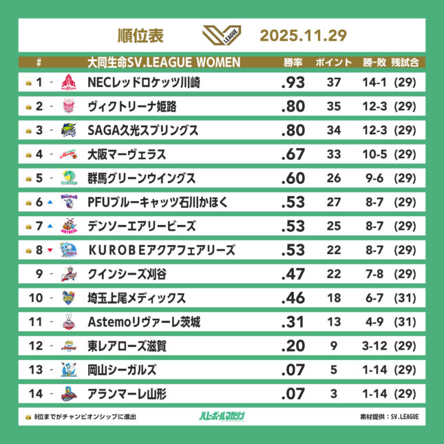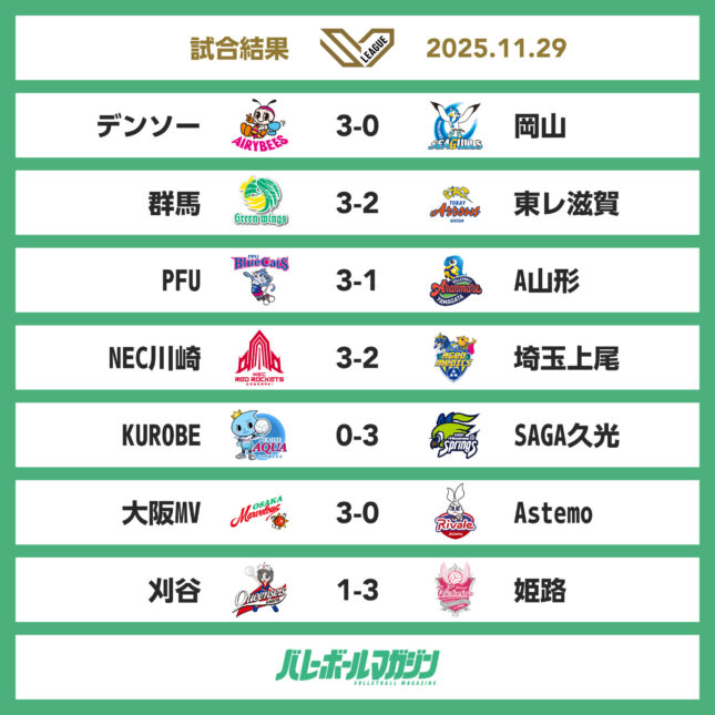 - 上位3チームがホームで白星を重ねる。大阪Bとサントリーがともに3-0で10勝目、WD名古屋がフルセットの末8勝目 SV男子 [SV男子] / 2025.11.30
