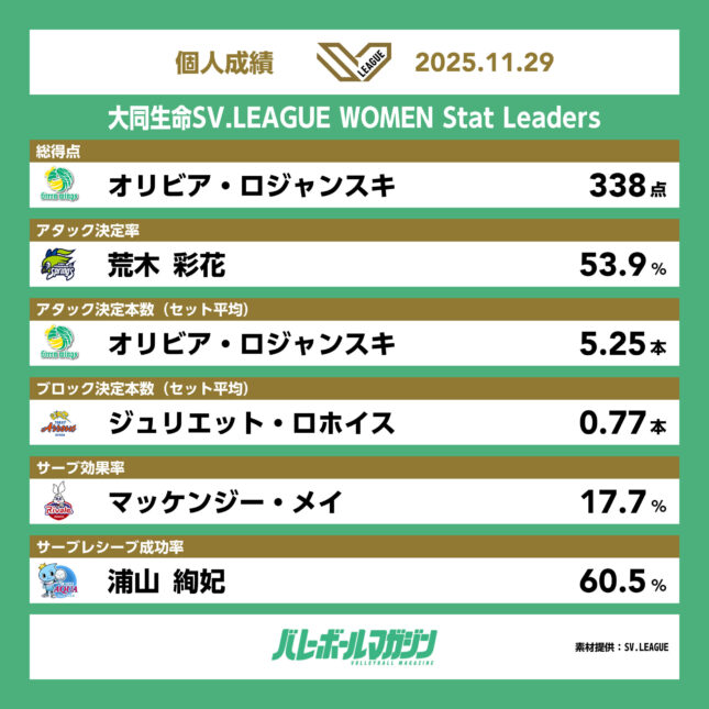 29日、バレーボール女子・大同生命SV.LEAGUE WOMENはGAME1の7試合が行われた。