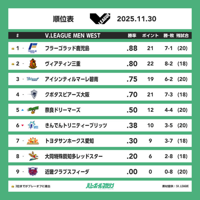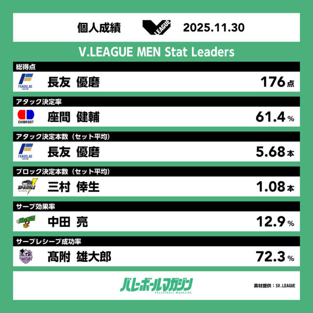 - 大阪Bとサントリーが11勝目、WD名古屋が9勝目。山内晶大とティモシー・カールの誕生日を勝利で飾る SV男子 [SV男子] / 2025.12.01