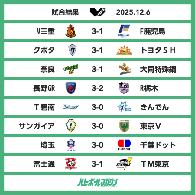 一方、西地区のAGF鈴鹿体育館ではヴィアティン三重とフラーゴラッド鹿児島が対戦し、セットカウント3-1でホームのヴィアティン三重が勝利した。ヴィアティン三重は9勝目を挙げ、順位を1つ上げて1位に浮上した。フラーゴラッド鹿児島は順位を2つ下げて3位に後退した。
