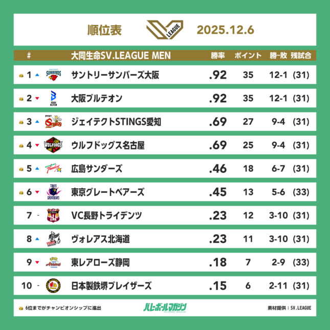 1位 サントリーサンバーズ大阪 12勝1敗 (勝率0.92, 35ポイント)
