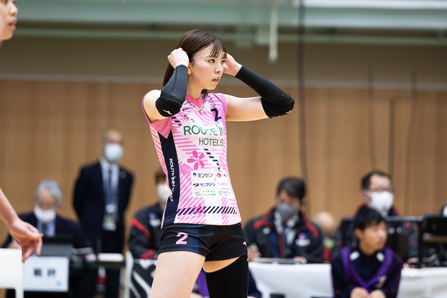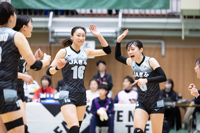 山村選手は前日と同数の6本、セッターの横田美穂選手も3本のブロックでJAぎふの攻撃を封じた。