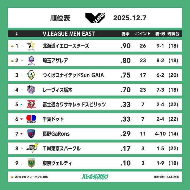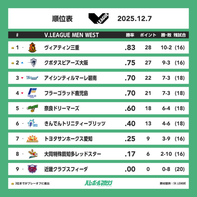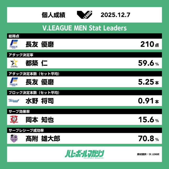 - サントリーが首位に、STINGS愛知が3位に浮上。ヴォレアスが3勝目 SV男子 [SV男子] / 2025.12.07