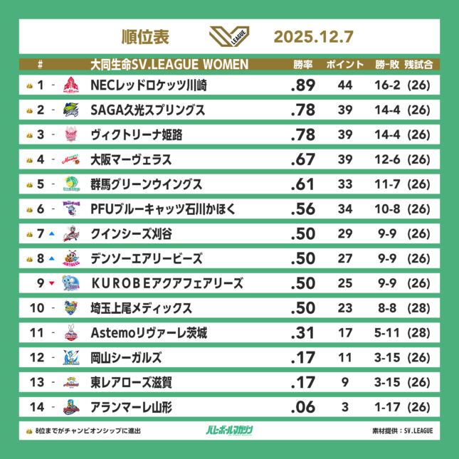 - PFUが皇后杯優勝の大阪MVに3-1で勝利。上位対決はNEC川崎が2勝 SV女子 [SV女子] / 2025.12.29