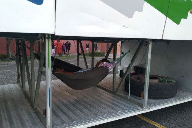 今日も暑い1日だった。選手を体育館に送った後、昼寝をするバスの運転手。