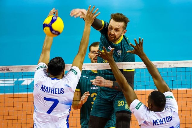 左からSブルーノ、MBジュジソン、OHアドリアーノ。ザビエルチェのブロックに抑え込まれてしまった(写真:Volleyball World)