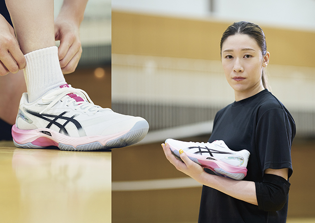 春の風からインスピレーションを受けた白とピンクの爽やかなグラデーションは見るだけで気分が上がりますし、このシューズを履いてバレーボールができることを楽しみにしております。自分自身のキャリアのなかで大きなきっかけとなったように、高校生にとって非常に大切な大会が迫っていると思います。このシューズとともに、積み重ねてきた日々の練習の成果をコートの上で最大限に表現してほしいです。