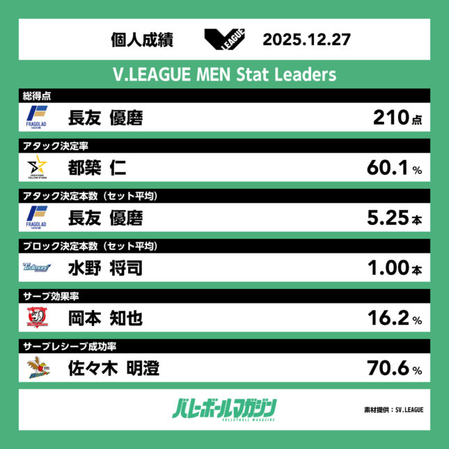 - 首位対決はサントリーに軍配。世界クラブ準優勝の大阪Bが2敗目。天皇杯準優勝のヴォレアスが東レ静岡にフルセットで惜敗 SV男子 [SV男子] / 2025.12.28