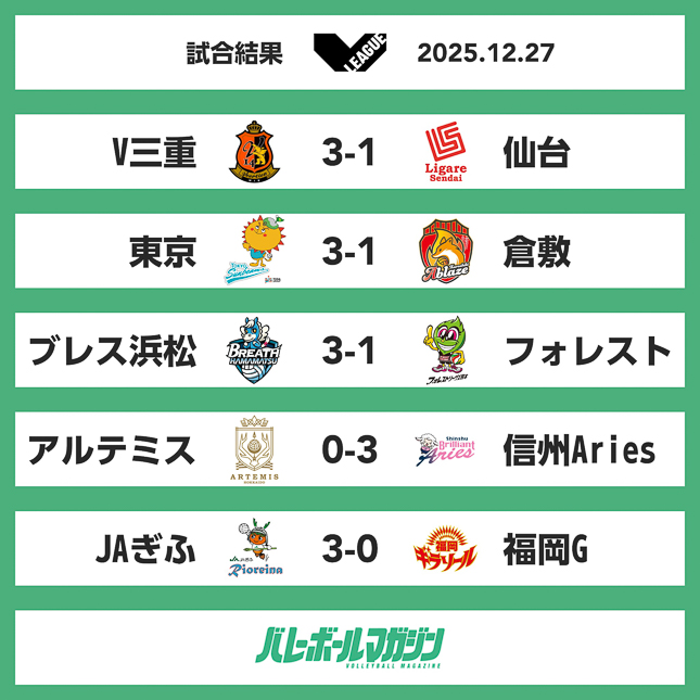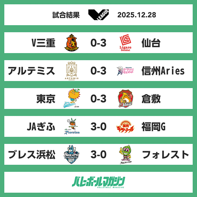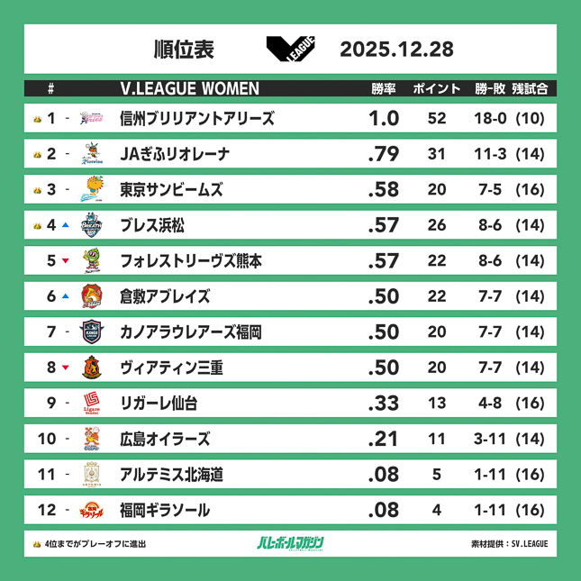 年内最終戦、中野は一進一退。倉敷アブレイズが反撃、東京サンビームズは3位で折り返し。信州ブリリアントアリーズが無敗の18連勝 V女子