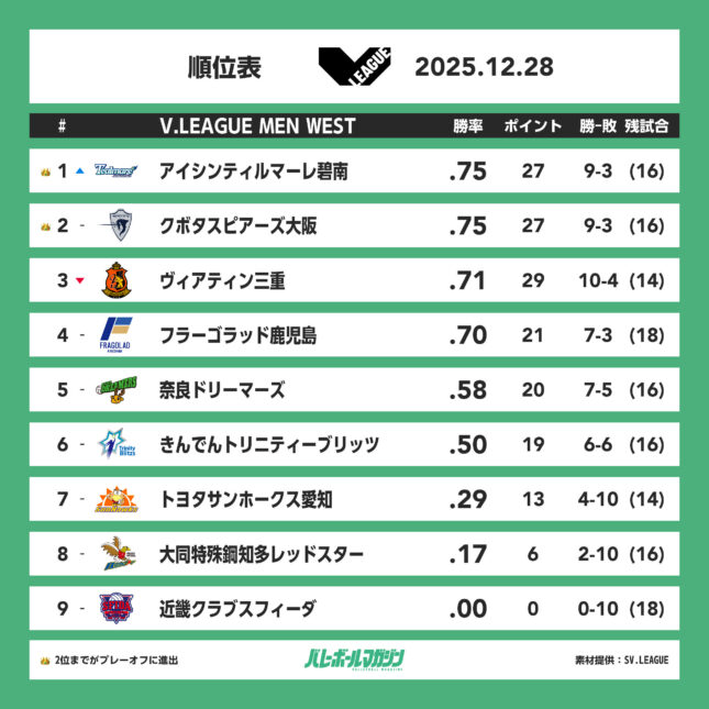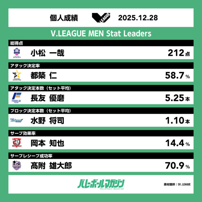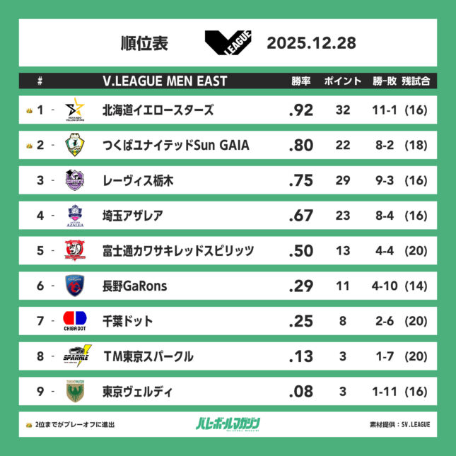 東地区は北海道YS、西地区はT碧南が首位で年内の試合を終える V男子