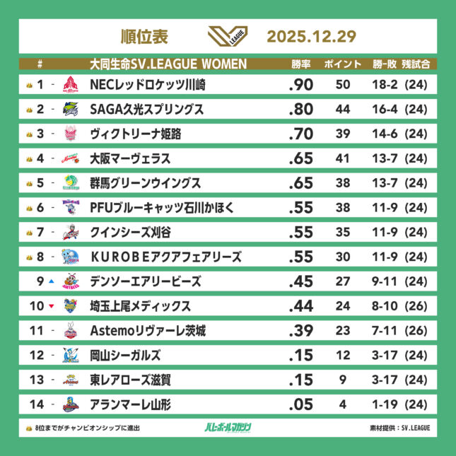 - 年内最終戦、中野は一進一退。倉敷アブレイズが反撃、東京サンビームズは3位で折り返し。信州ブリリアントアリーズが無敗の18連勝 V女子 [V女子] / 2025.12.31