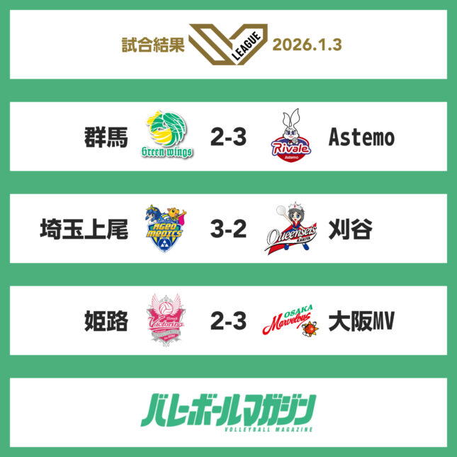 新年初の3試合がすべてフルセットに! 埼玉上尾、Astemo、大阪MVが接戦を制す SV女子